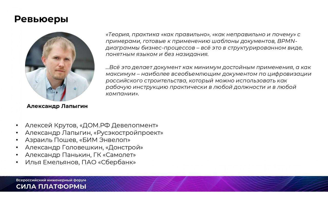 «Стандарт читается легко — без лишней теории, с фокусом на реальную практику. Учтены ключевые аспекты, включая важную мысль: не стоит внедрять "BIM ради BIM". На рынке давно не хватало документа, который можно назвать настольной книгой BIM-специалиста. Отличная работа авторов».